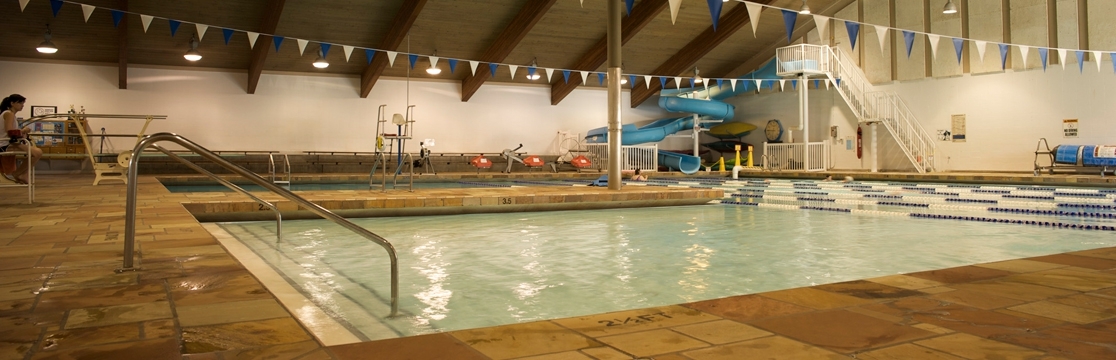 Six 25-yard lap lanes, a shallow area ranging from 2.5 to 4 feet deep, and a deep area ranging from 7 to 12 feet deep, a 1-meter diving board, and an observation/seating area.